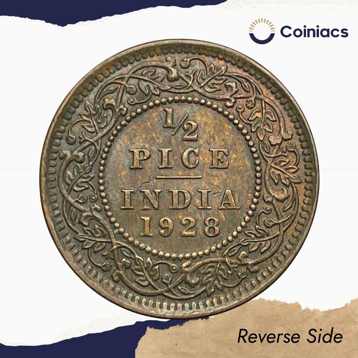 1/2 Pice George V King Emperor 1928 Calcutta Mint Bronze Coin, British India Uniform Coinage, XF.