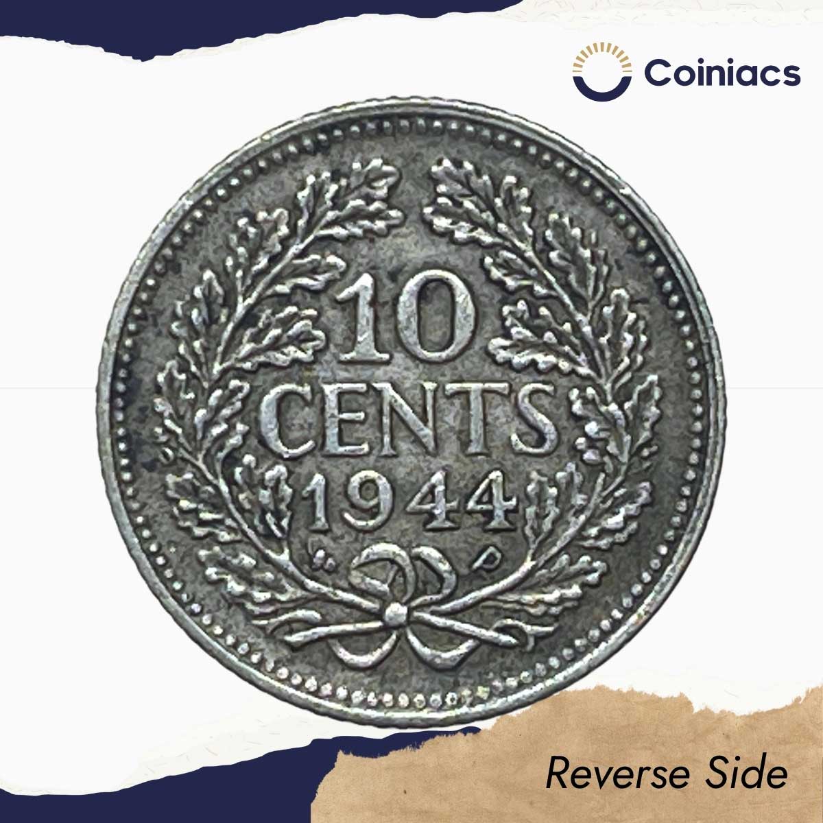10 Cents Wilhelmina 1944 United States Mint of Philadelphia 6.5 gms Silver Coin, Netherlands, Collectible.