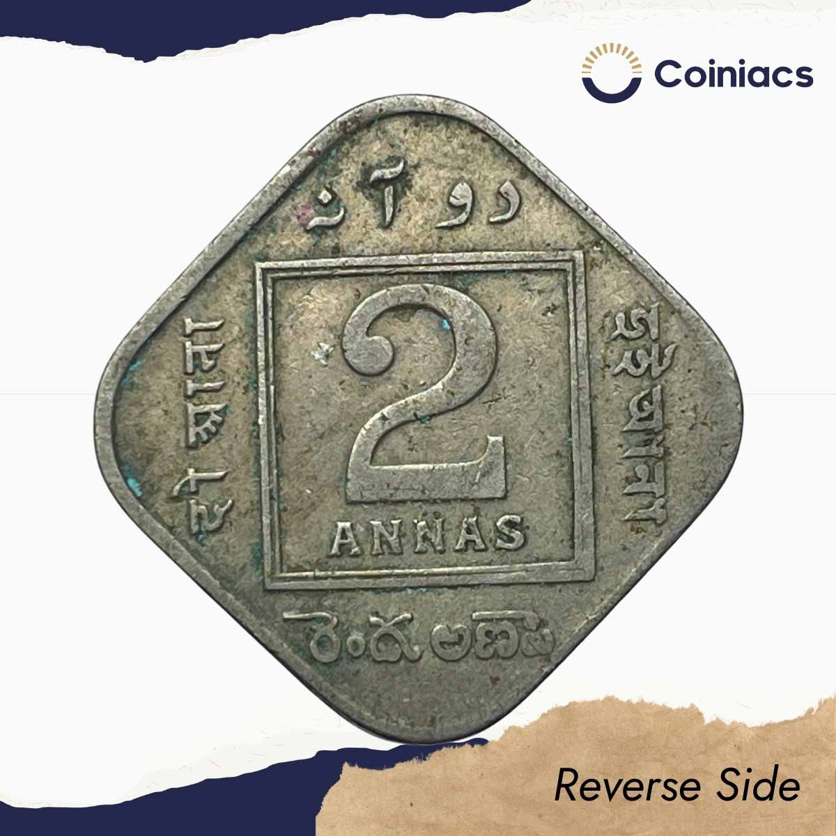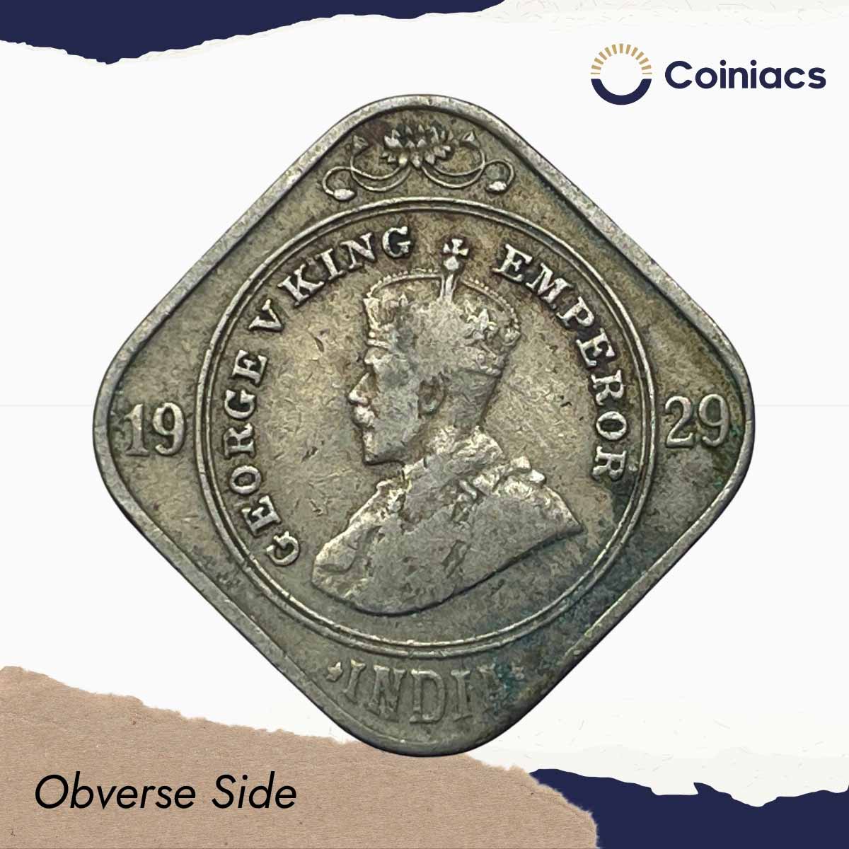 2 Annas George V King Emperor 1929 Calcutta Mint Cupro-Nickel Coin, British India Uniform Coinage, Collectible.