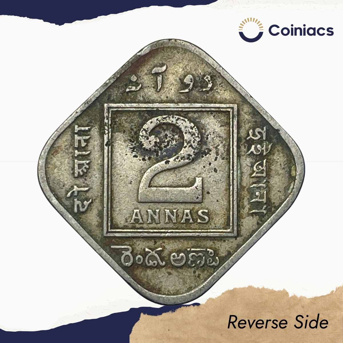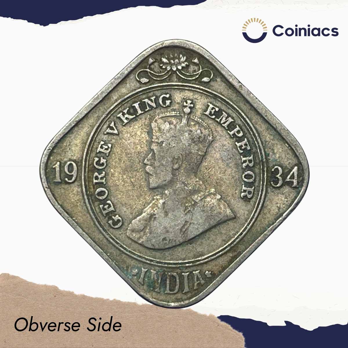2 Annas George V King Emperor 1934 (Key Date) Calcutta Mint Cupro-Nickel Coin, British India Uniform Coinage, Collectible.