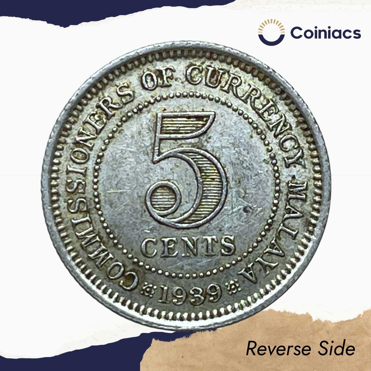 5 Cents George VI 1939 Royal Mint (Tower Hill) Silver Foreign Coin, Malaya (Malaysia), XF+.