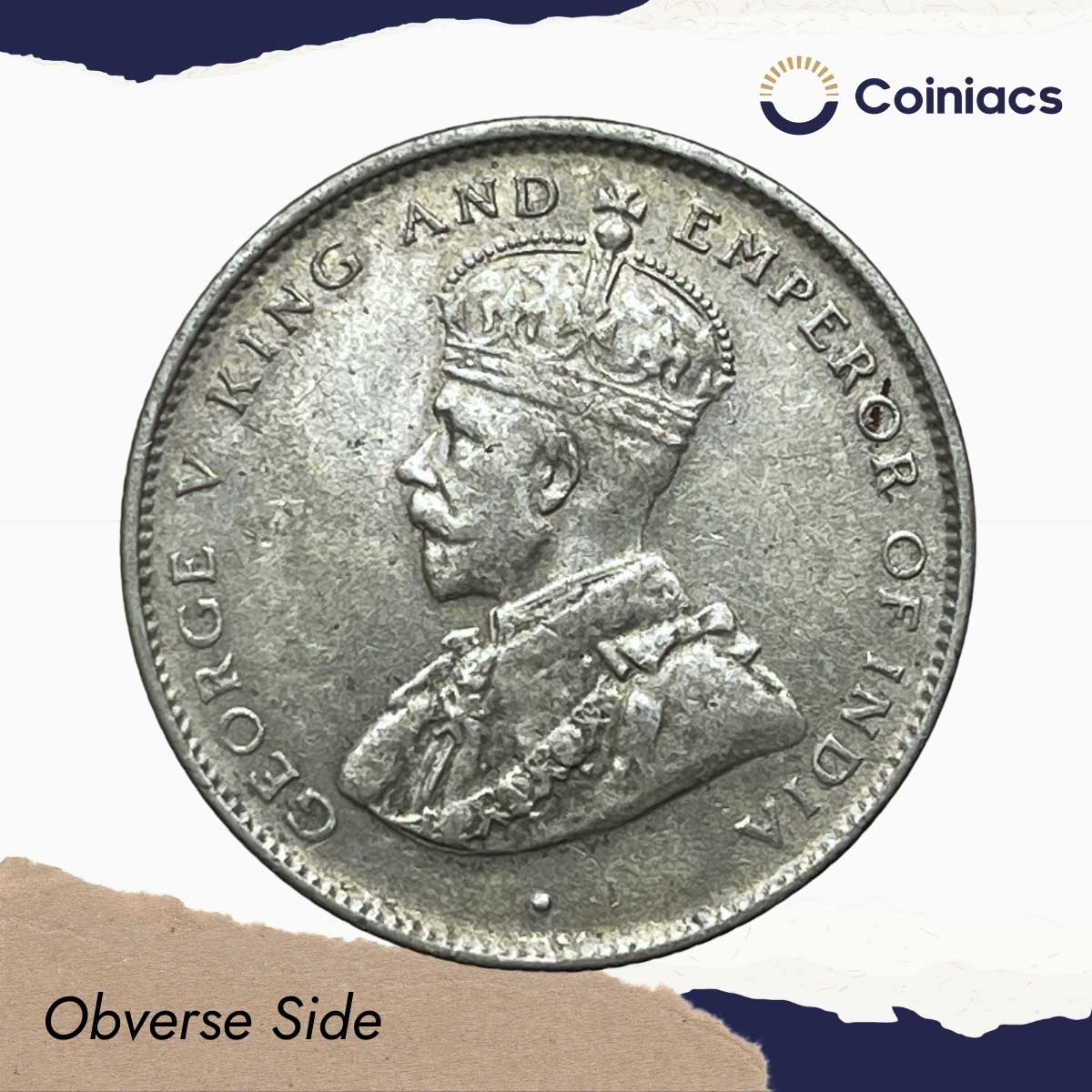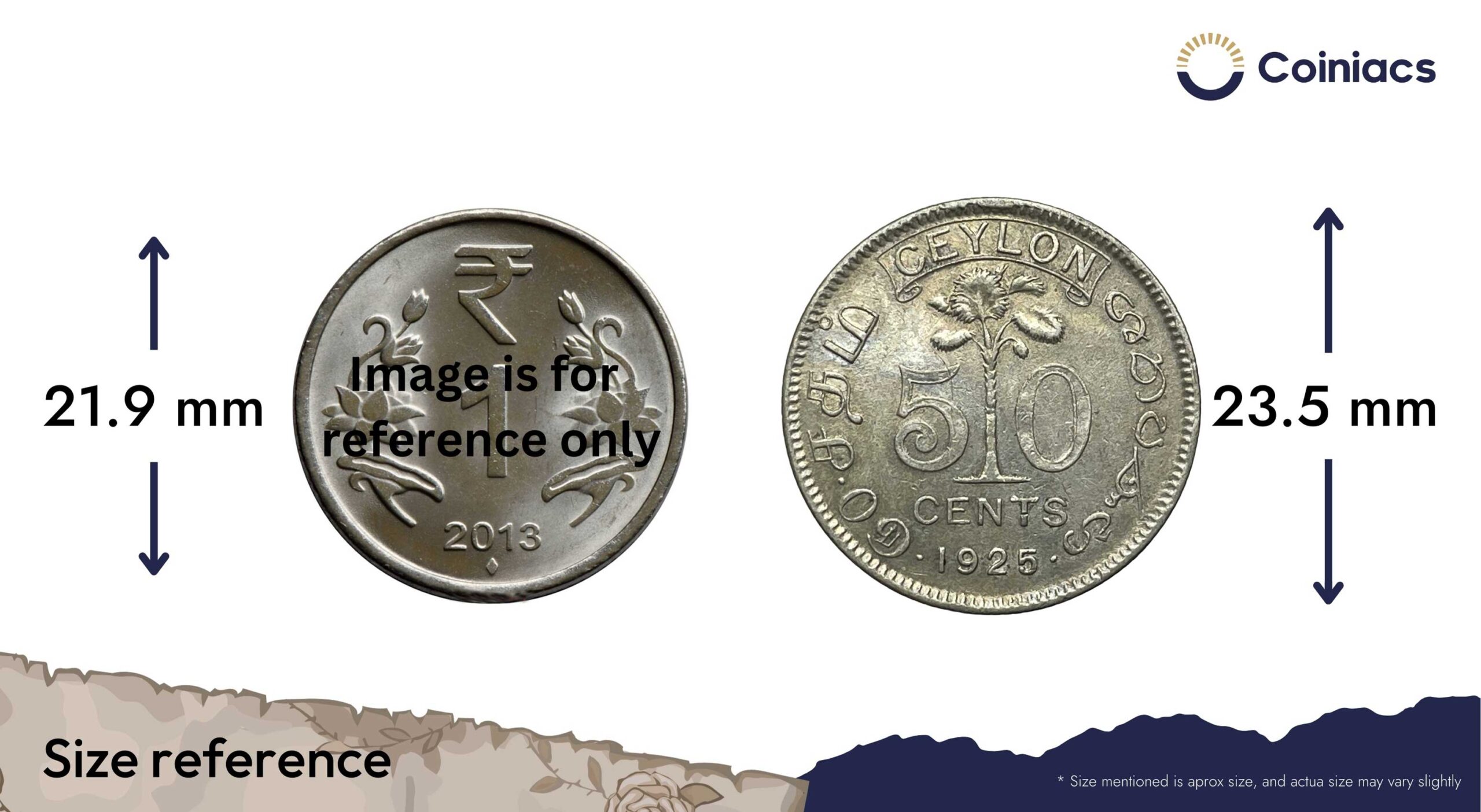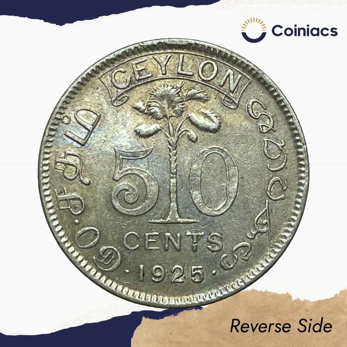 50 Cents George V 1925 Royal Mint (Tower Hill) Silver Coin, Ceylon, Collectible.