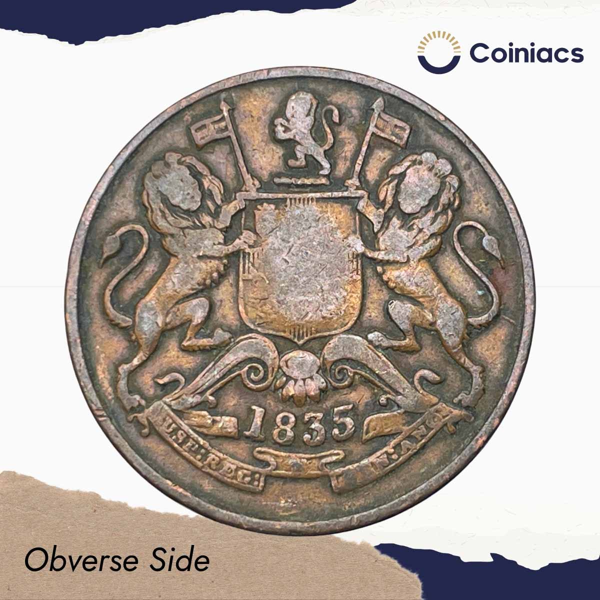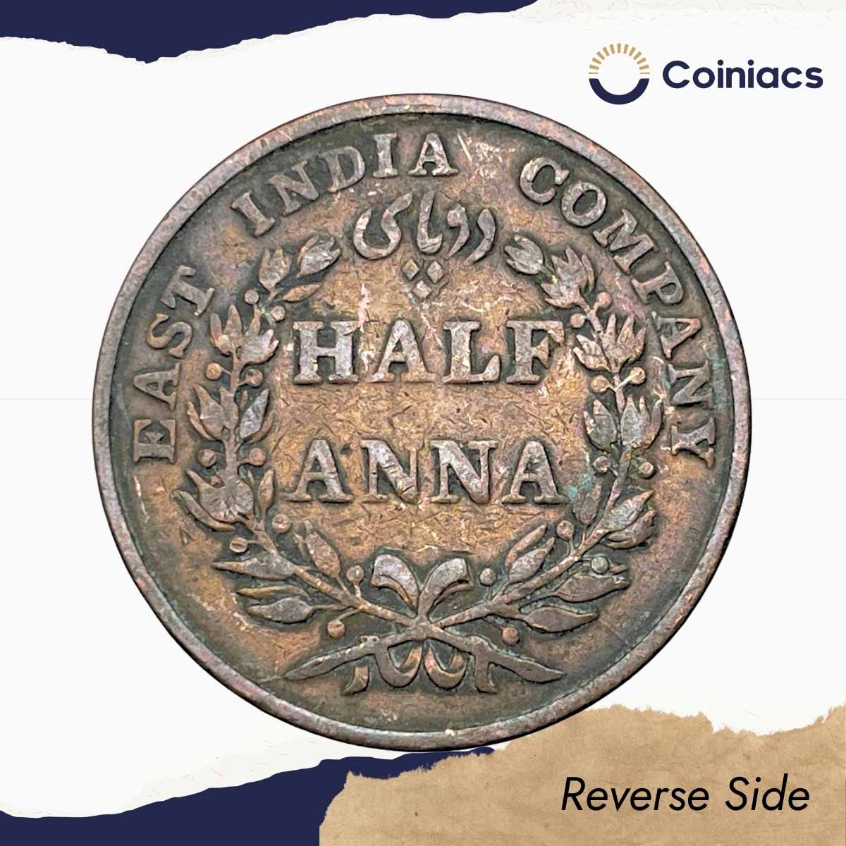 Half Anna East India Company 1835 Copper Coin, British India Uniform Coinage, Collectible.