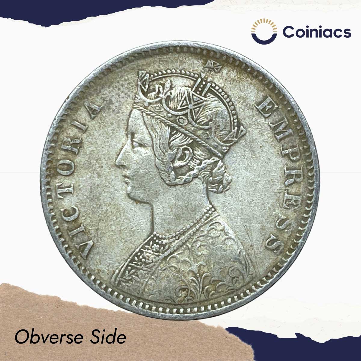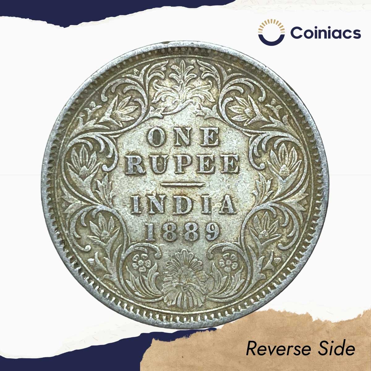 One Rupee Victoria Empress 1889 CE (Obv C3, Rev I(i)) ‘C’ Incused Calcutta Mint Silver Coin, British India Uniform Coinage, Collectible.