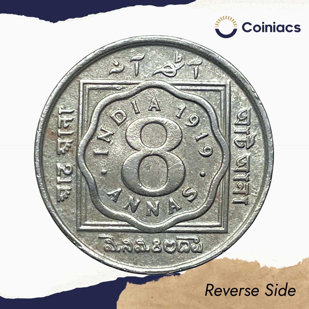 Rare 8 Annas George V King Emperor 1919 Calcutta Mint Cupro-Nickel Coin, British India Uniform Coinage, XF.