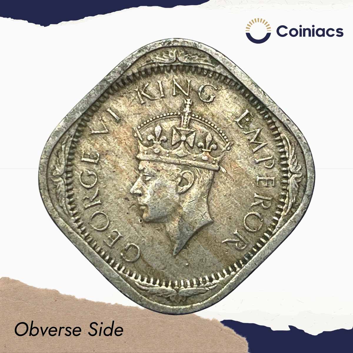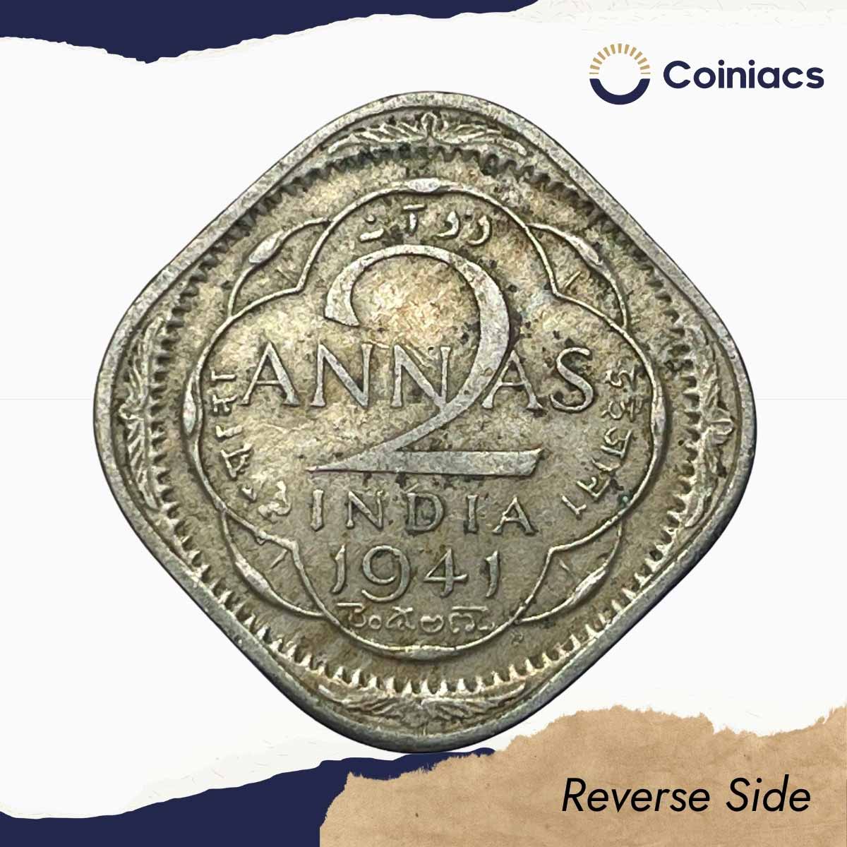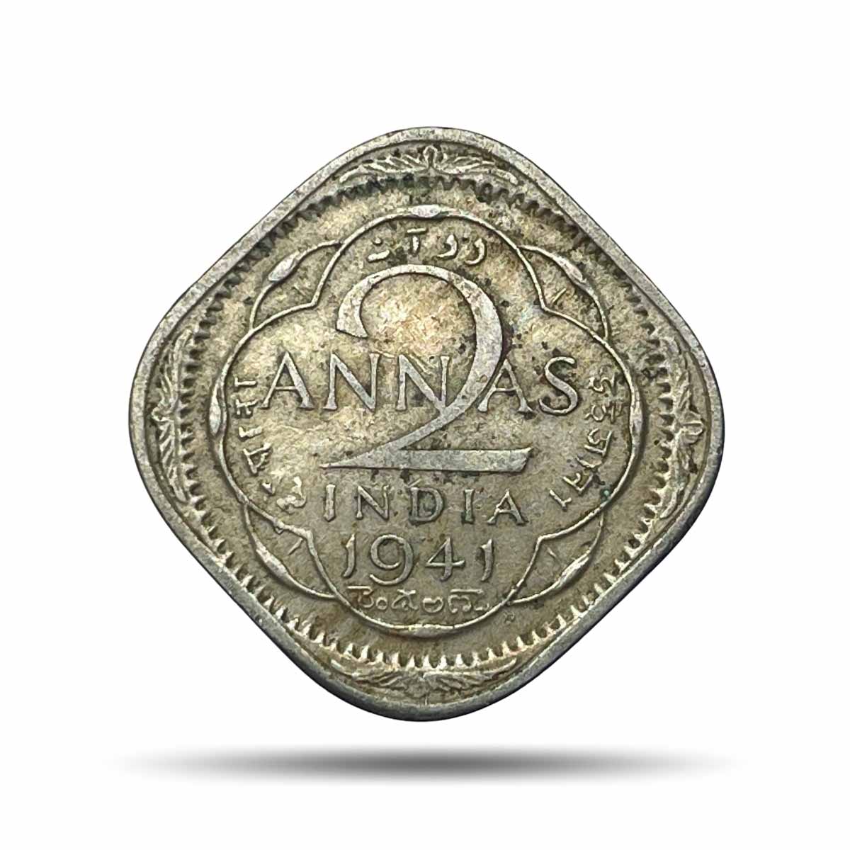 Scarce 2 Annas George VI King Emperor 1941 Calcutta Mint Cupro-Nickel Coin, British India Uniform Coinage, Collectible.
