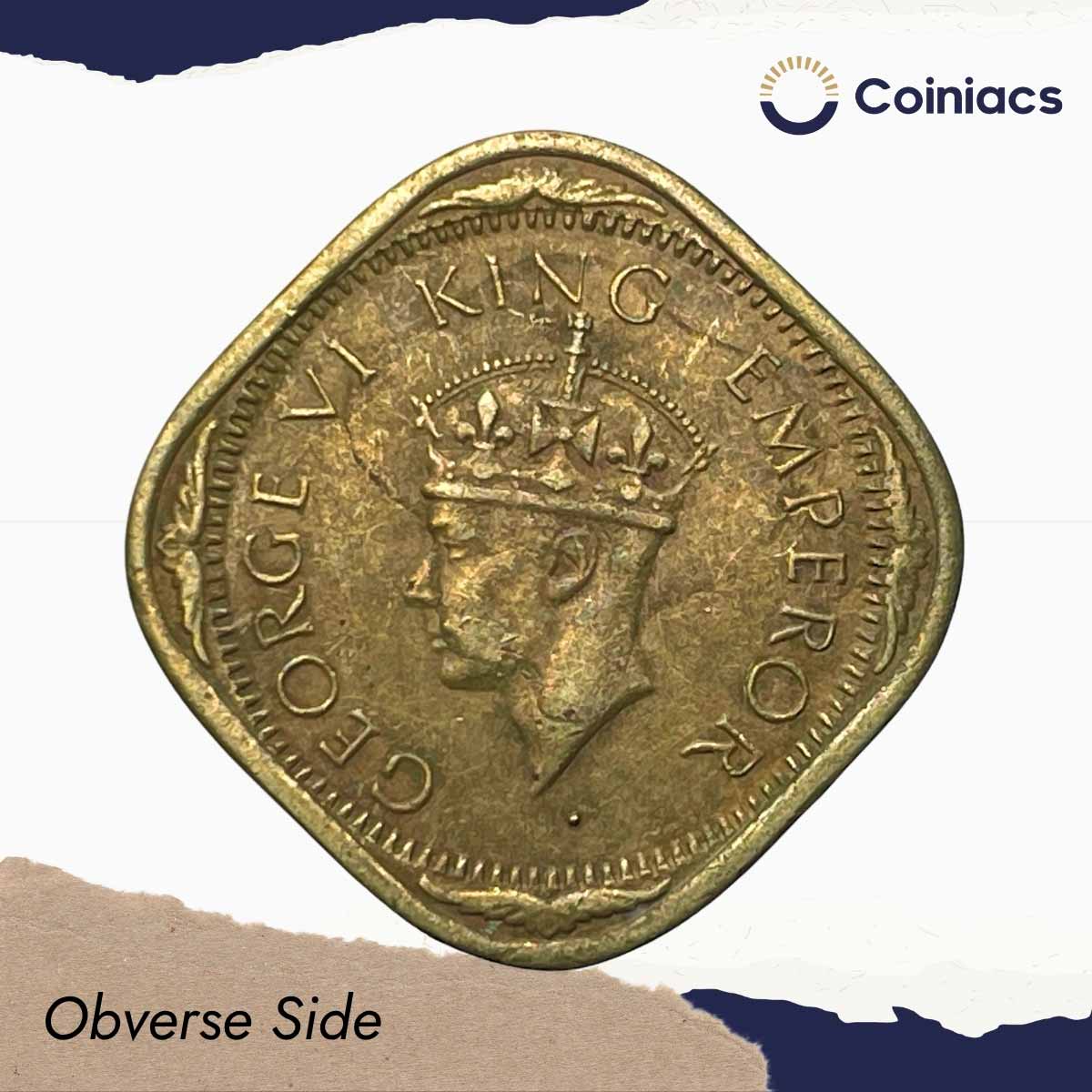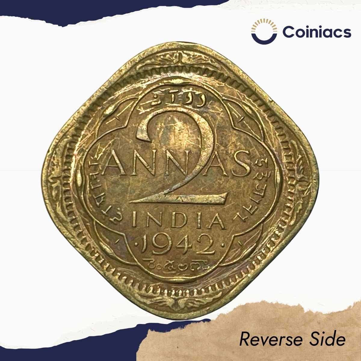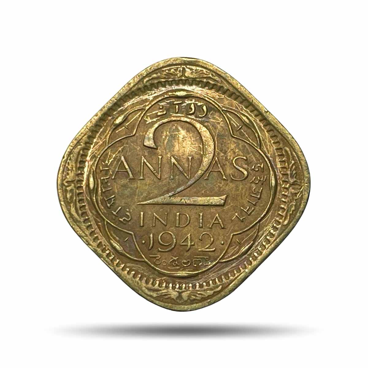 Scarce 2 Annas George VI King Emperor 1942 (Small ‘4’) Bombay Mint Nickel-Brass Coin, British India Uniform Coinage, Collectible.
