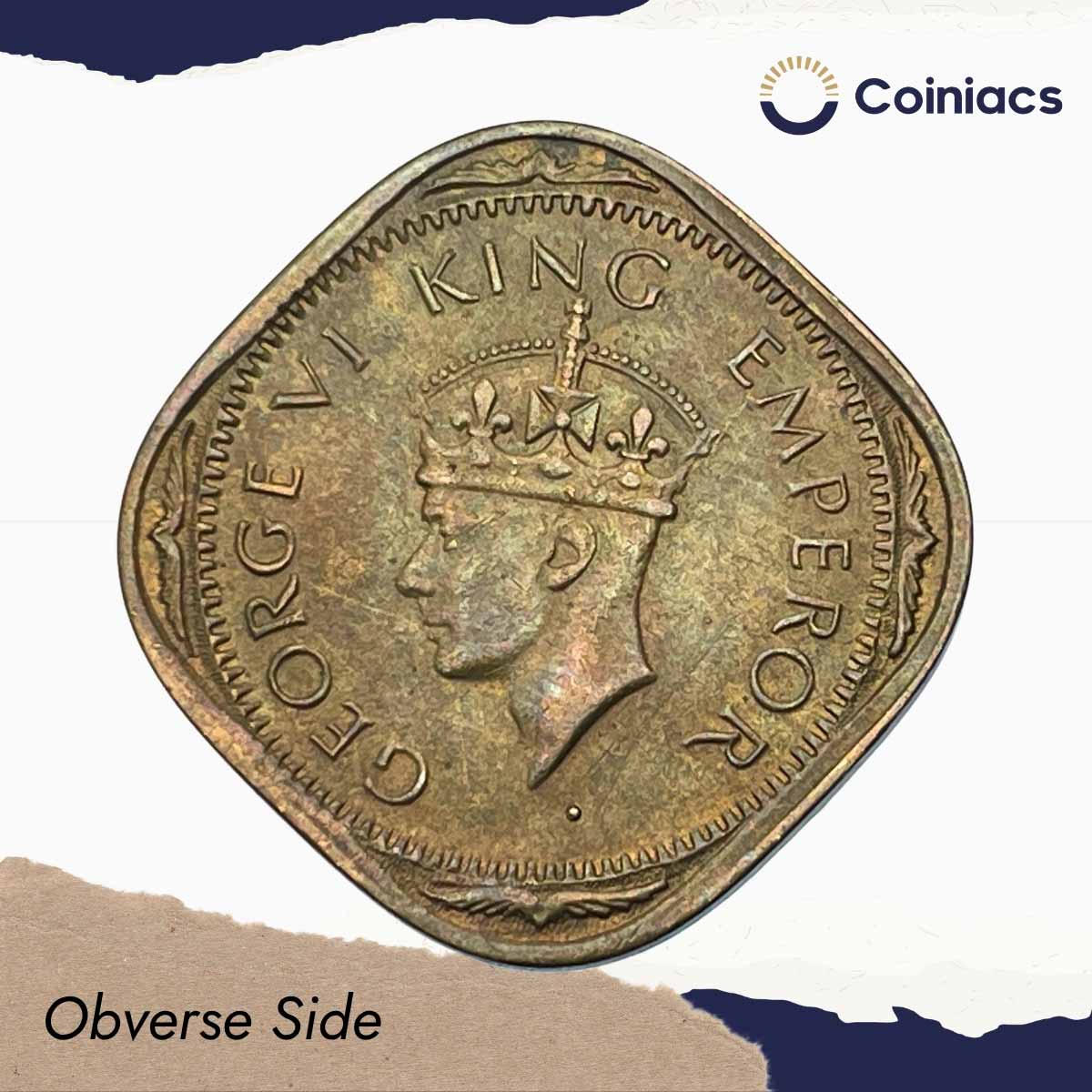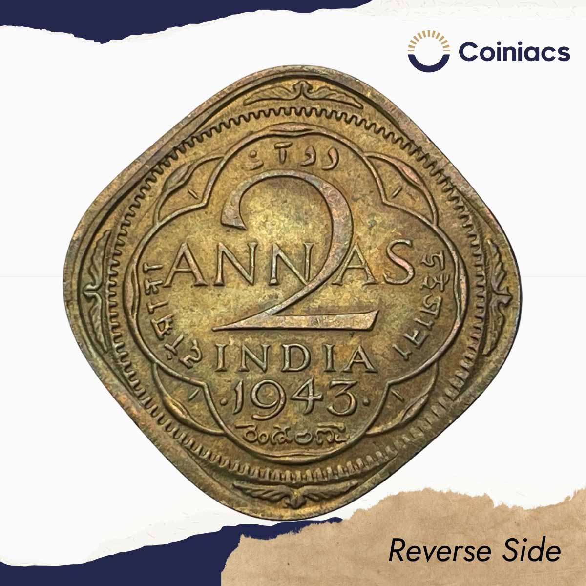 Scarce 2 Annas George VI King Emperor 1943 Bombay Mint Nickel-Brass Coin, British India Uniform Coinage, XF+.