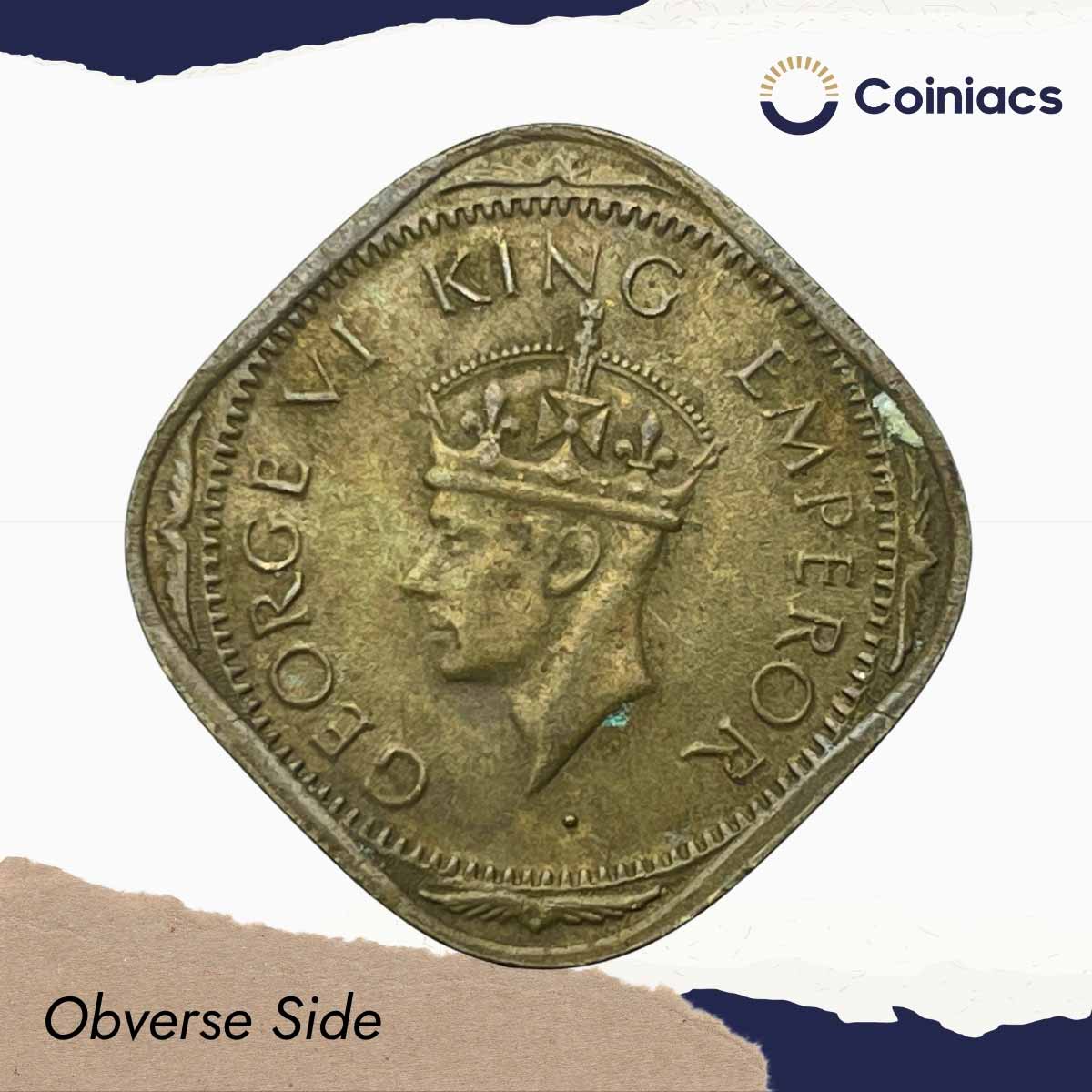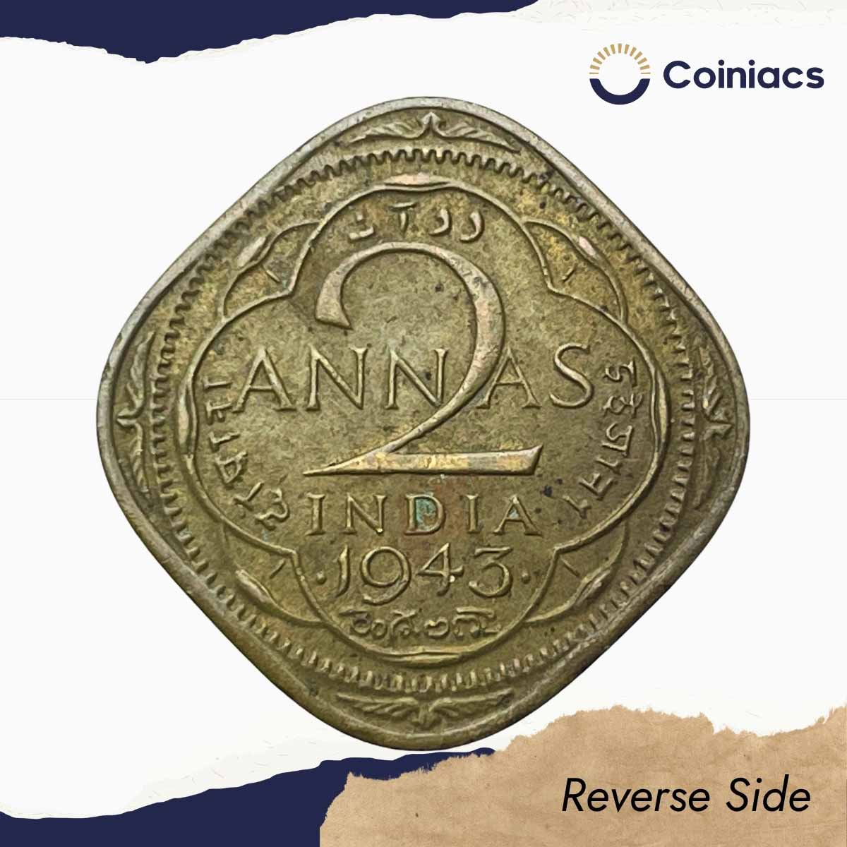 Scarce 2 Annas George VI King Emperor 1943 (Thick ‘3’) Bombay Mint Nickel-Brass Coin, British India Uniform Coinage, Collectible.