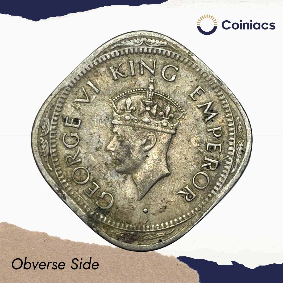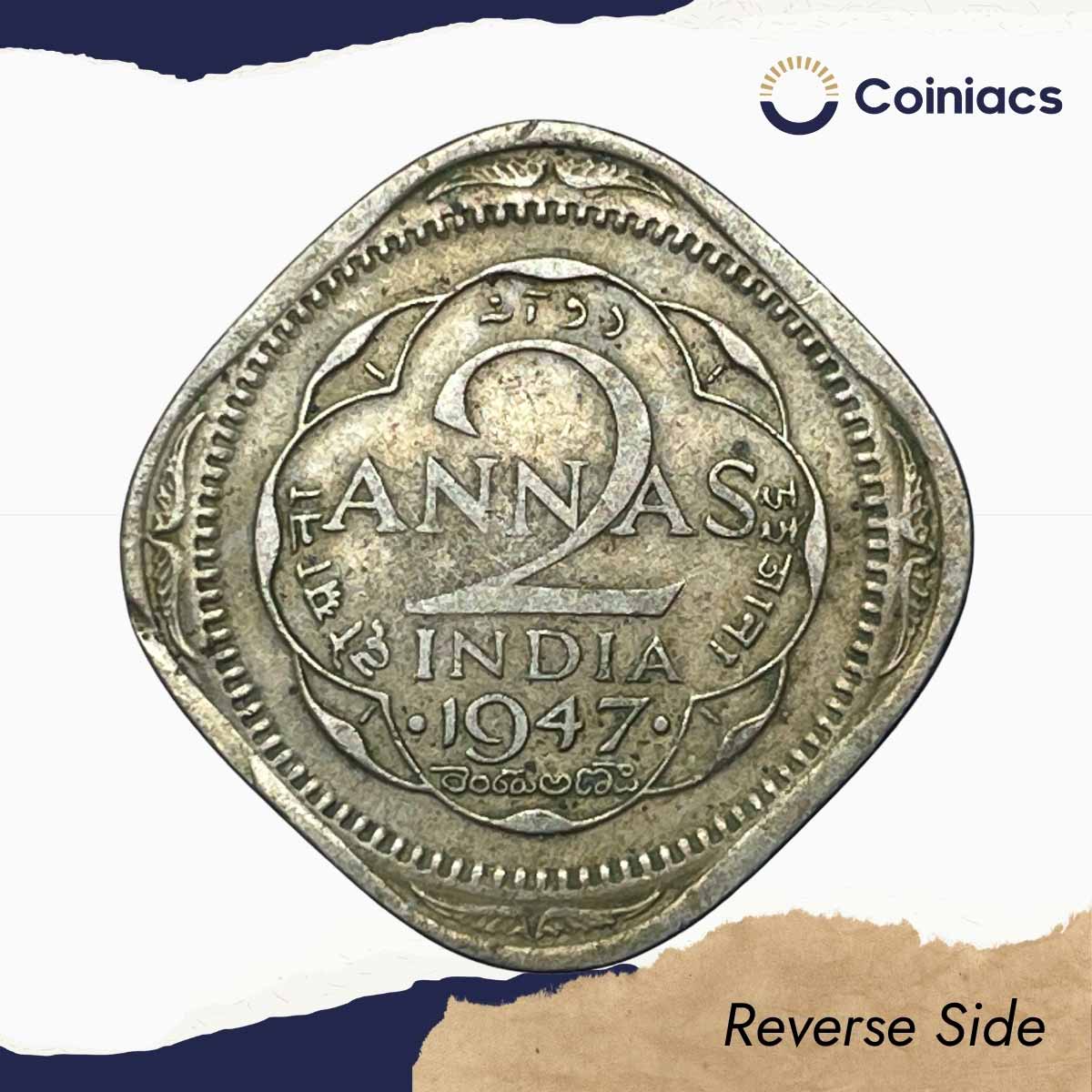Scarce 2 Annas George VI King Emperor 1947 (Thick Dot) Bombay Mint Cupro-Nickel Coin, British India Uniform Coinage, Collectible.