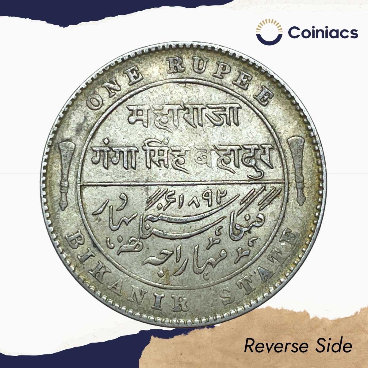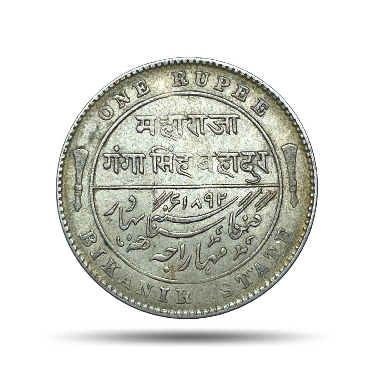 Scarce One Rupee Ganga Singh Bahadur in the name of Victoria Empress 1892 CE Silver coin, Princely State of Bikanir (Bikaner), XF+.