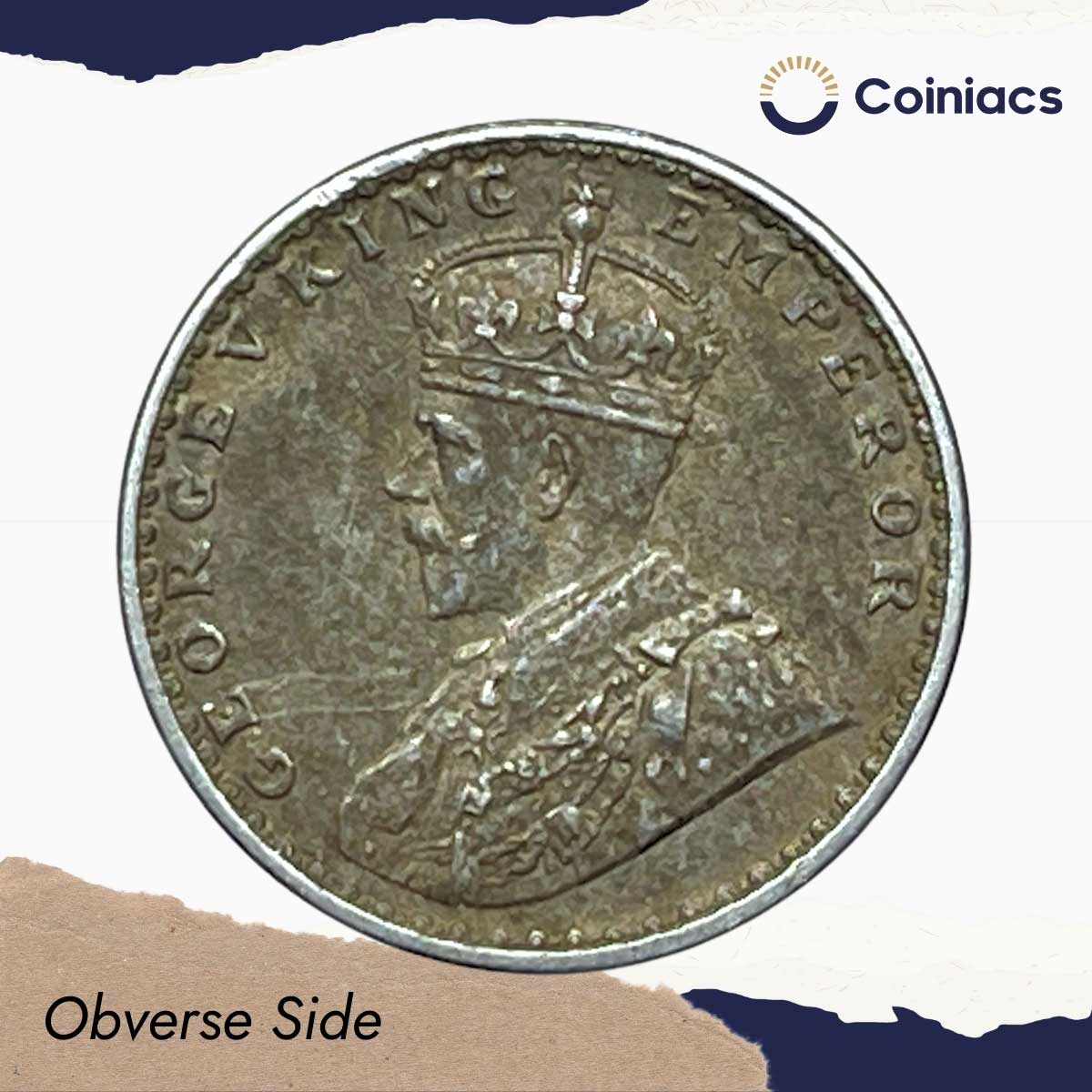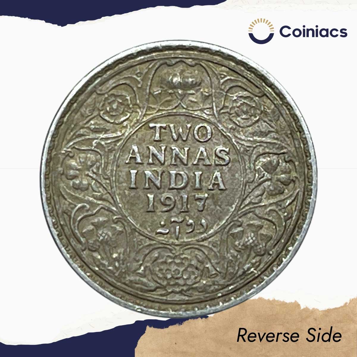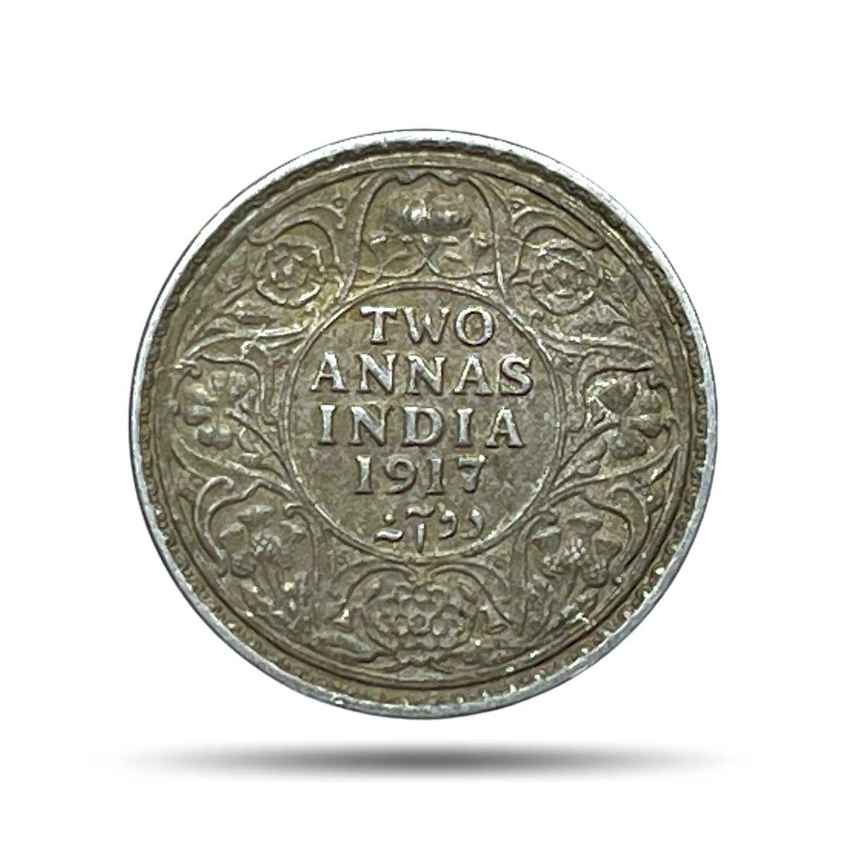 Two Annas George V King Emperor 1917 Calcutta Mint Silver Coin, British India Uniform Coinage, Collectible.