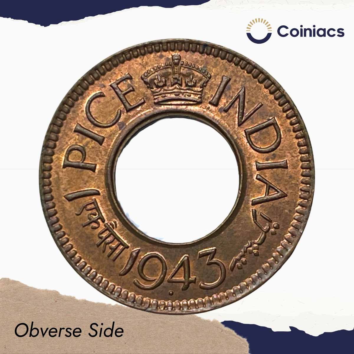 UNC 1 Pice (Hole Pice) George VI King Emperor 1943 Bombay Mint Bronze Coin, British India Uniform Coinage, UNC.