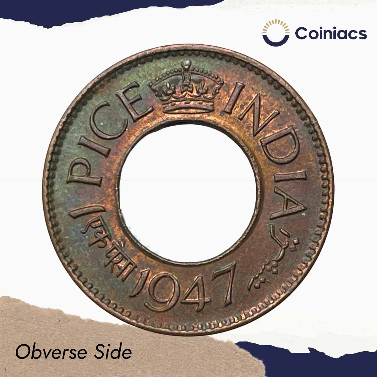 UNC 1 Pice (Hole Pice) George VI King Emperor 1947 Calcutta Mint Bronze Coin, British India Uniform Coinage, UNC.