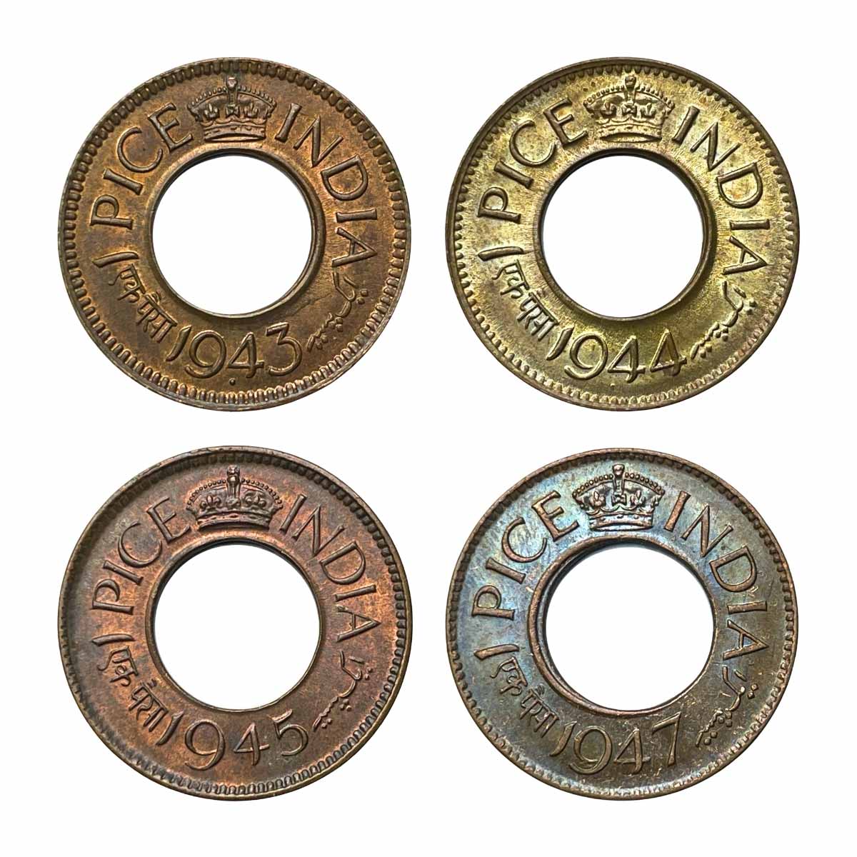 UNC SET of Pice all 4 Dates (1943,1944,1945,1947) Bronze Coin, British India Uniform Coinage, UNC